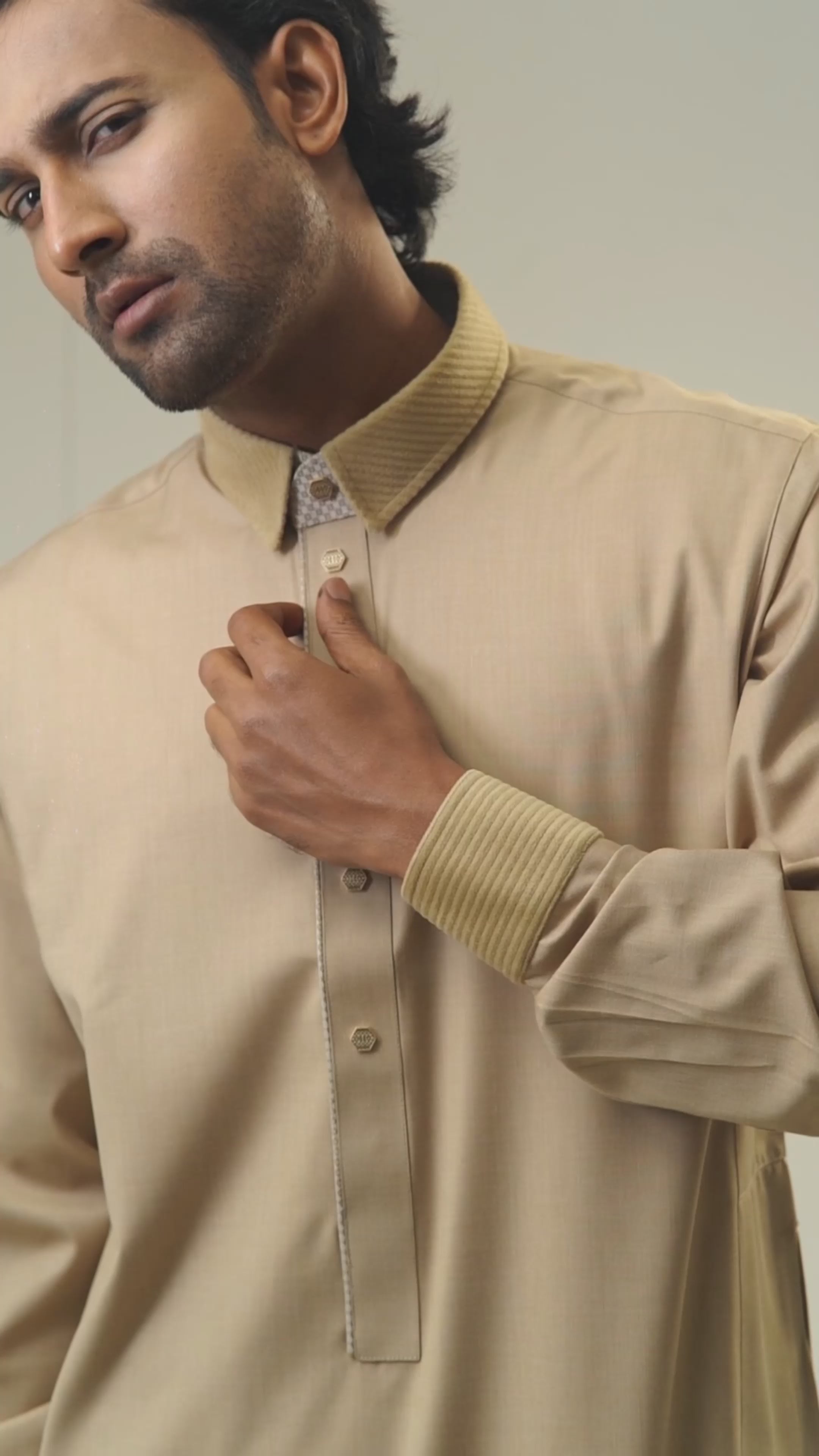 This thobe features a corduroy collar and cuff for an extremely comfortable fit, especially for bearded individuals.
