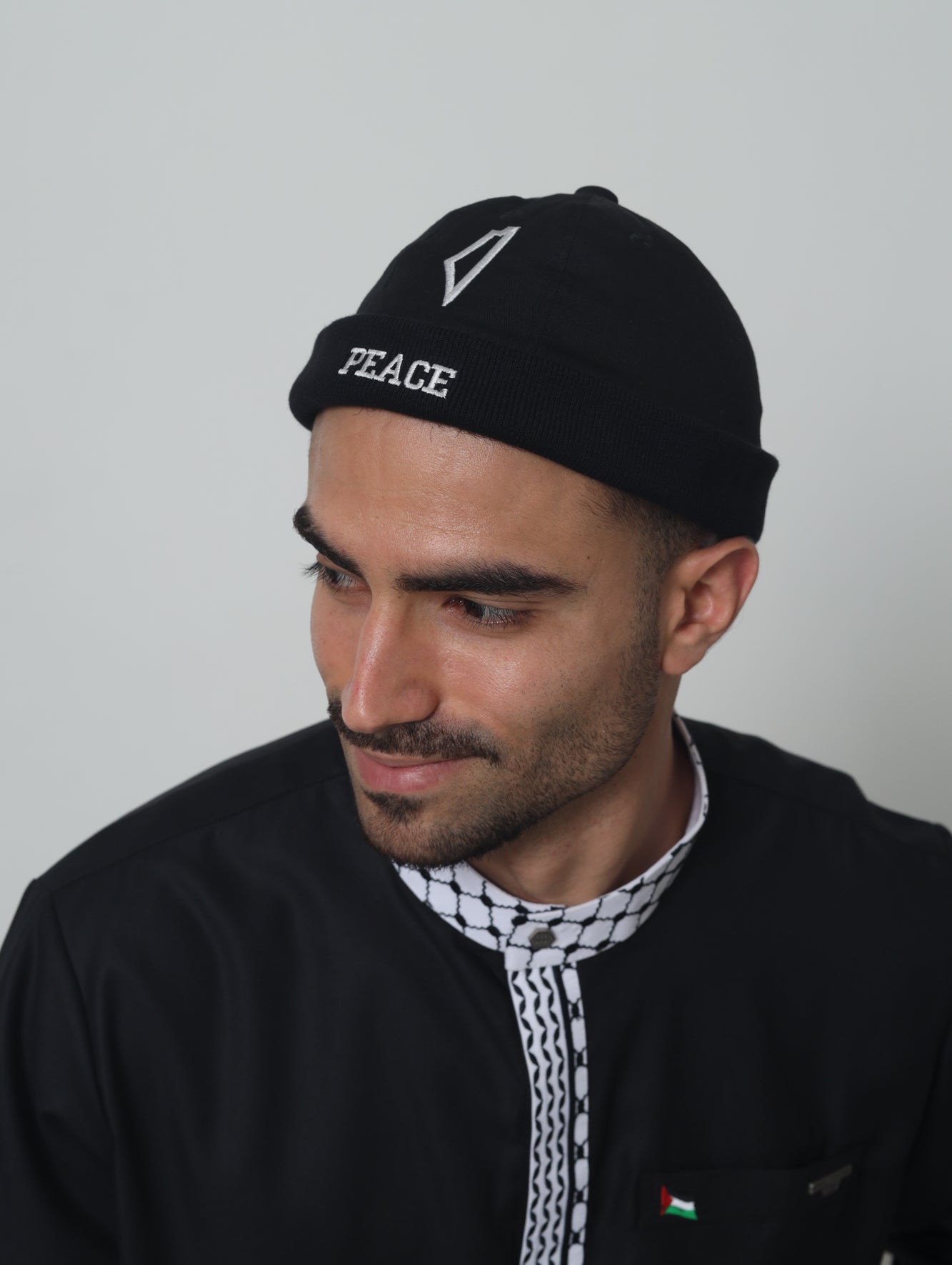 An All-black brimless hat with the shape of palestine in the forefront, along with a stitched "Peace" lettering to show your solidarity for humanity.