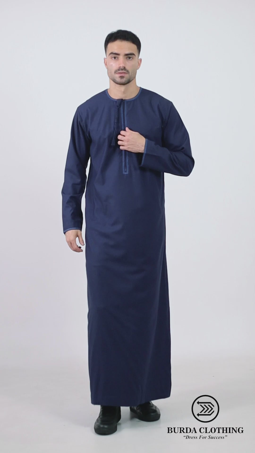 A low-profile Emirati style thobe, with minimal embroidery and the iconic tassel.
