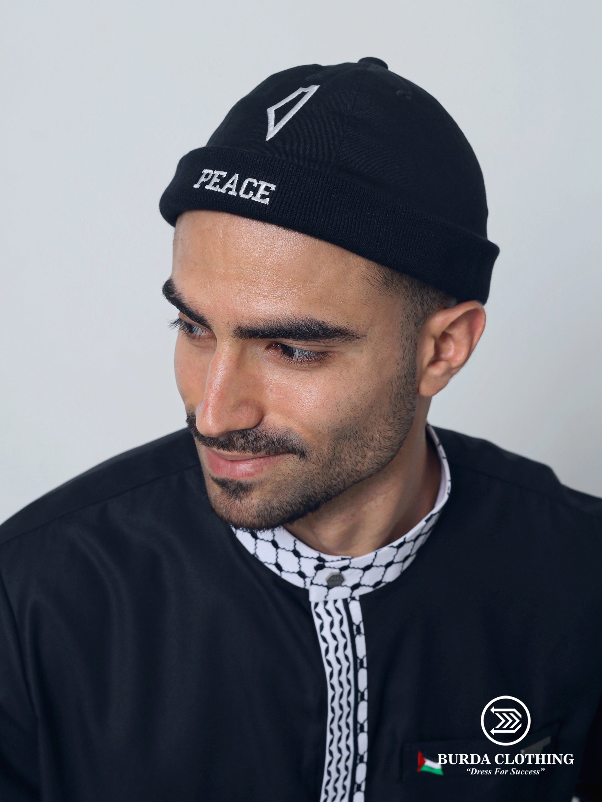 Ein komplett schwarzer Hut ohne Krempe mit der Form Palästinas im Vordergrund und einem aufgestickten „Peace“-Schriftzug, um Ihre Solidarität mit der Menschheit zu zeigen.