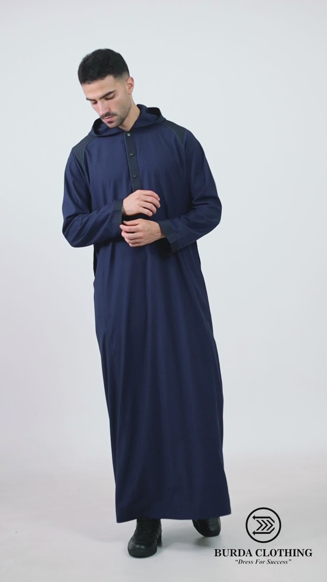 A simple Navy hoodie thobe, with dark blue elements.