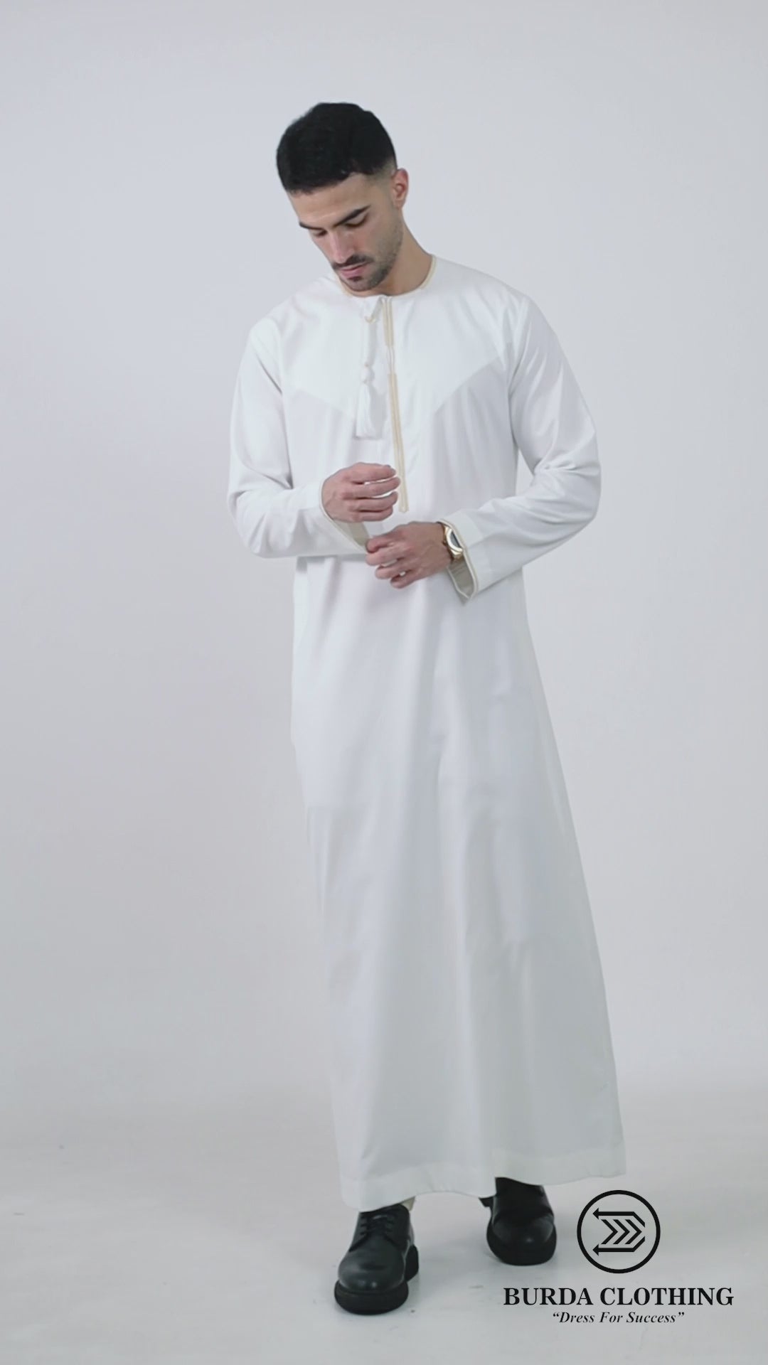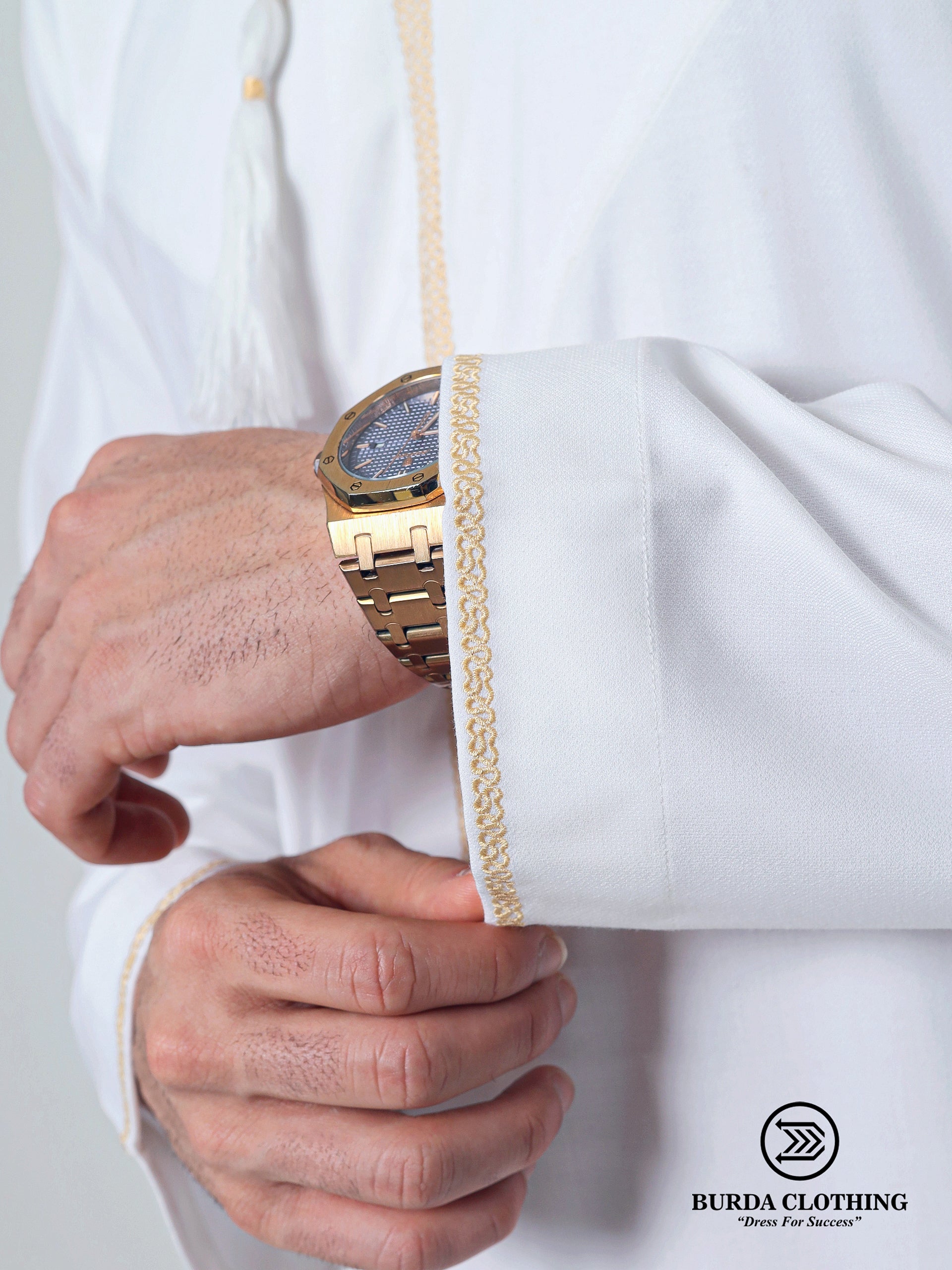 White and Gold, the ultimate combo, now in an Emirati style thobe. The Gold threading is expertly stitched in a relaxing pattern, sure to be a conversation starter for many.